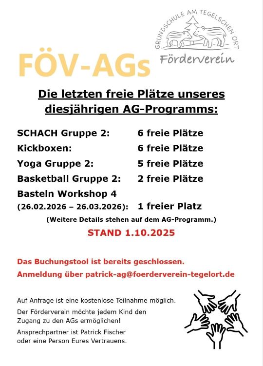 1. wir wollen mit unseren AG-Programm nicht in Konkurrenz treten mit dem Hort und werden schauen welche Angebote nicht ausgebucht sind und werden unser Programm entsprechend anpassen. Mittelfristig. Wir brauchen unbedingt noch einige Eltern, die beim AG-Programm mitarbeiten möchten und Verantwortung übernehmen möchten. Meldet Euch bitte bei Lina.